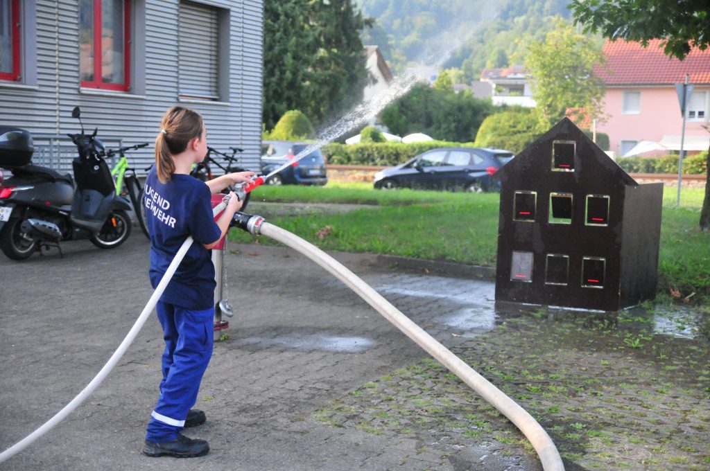 Beim Brandhaus war zielen gefragt: Über kleine Fenster mussten „Brandklappen“ gelöscht werden – eine Übung, die echtes Einsatzgefühl aufkommen ließ. Ebenfalls viel Geschick war bei der Station gefragt, an der mit Wasserstrahlen Kugeln von Pylonen gespritzt werden mussten.